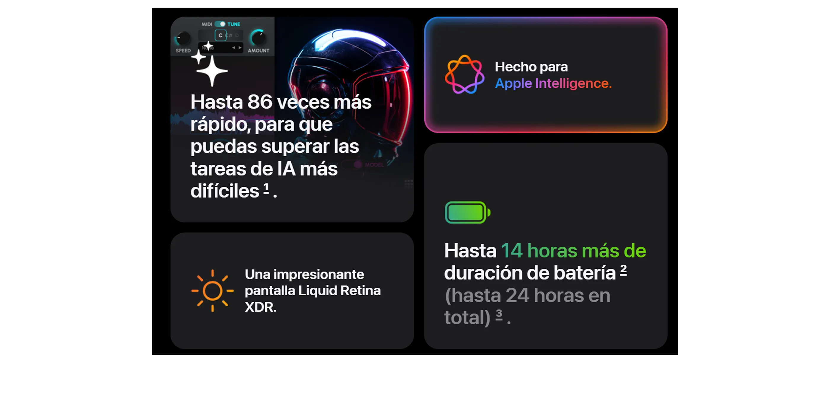 La batería más duradera de una Mac. Hasta 24 horas y se carga rápidamente hasta el 50 % en 30 minutos.Este punto aparece constantemente en reseñas y comentarios: la batería cambia la forma de trabajar, no solo la duración.