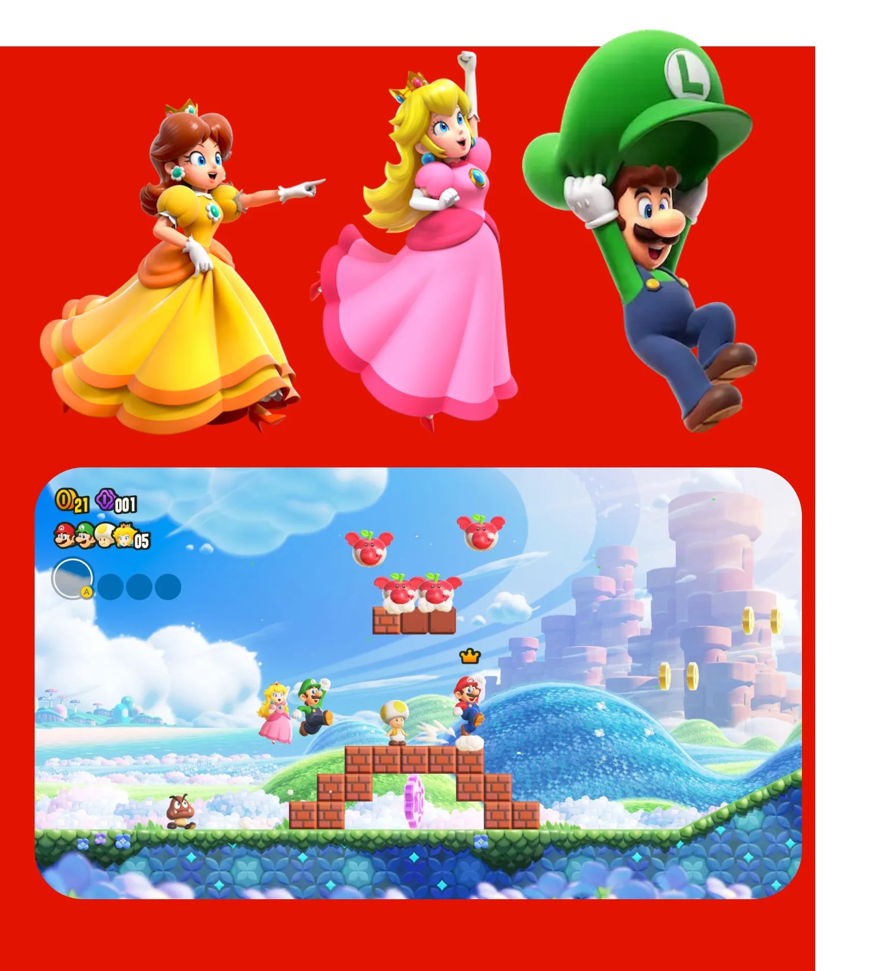 Super Mario Bros. Wonder presenta uno de los elencos de personajes jugables más amplios de la franquicia, con hasta 12 personajes disponibles, incluidos favoritos como Mario, Luigi, Peach, Daisy y Yoshi, cada uno con su propio estilo visual y personalidad. El título combina elementos clásicos con novedades, como poderosos objetos especiales y transformaciones que alteran la forma de los personajes o del mundo a su alrededor, añadiendo variedad y un alto valor de rejugabilidad a la experiencia.