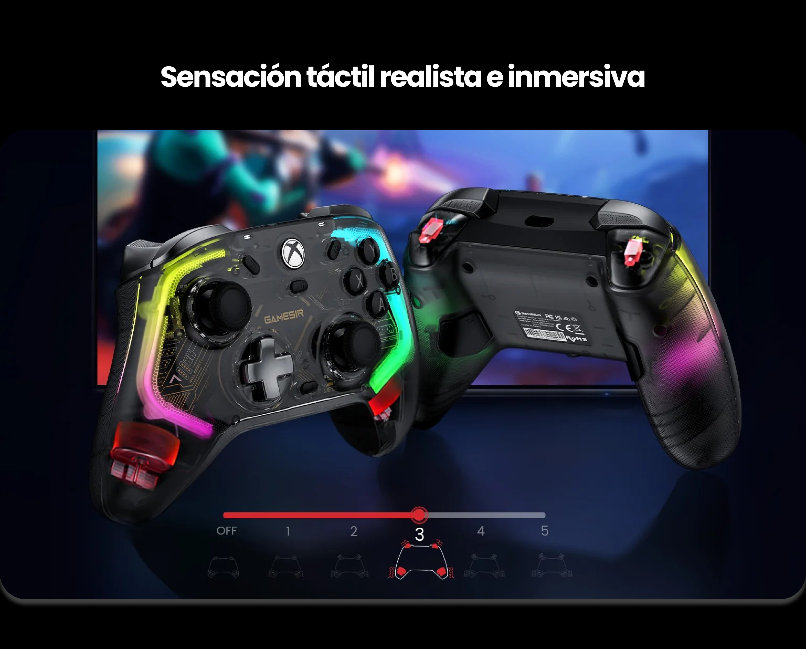 Este control gamer ofrece alta precisión y un rendimiento constante con sticks y gatillos Hall Effect, garantizando durabilidad y respuestas rápidas. Los cuatro motores de vibración proporcionan una sensación táctil más realista, mientras que el modo hair trigger permite acciones más rápidas durante el juego.