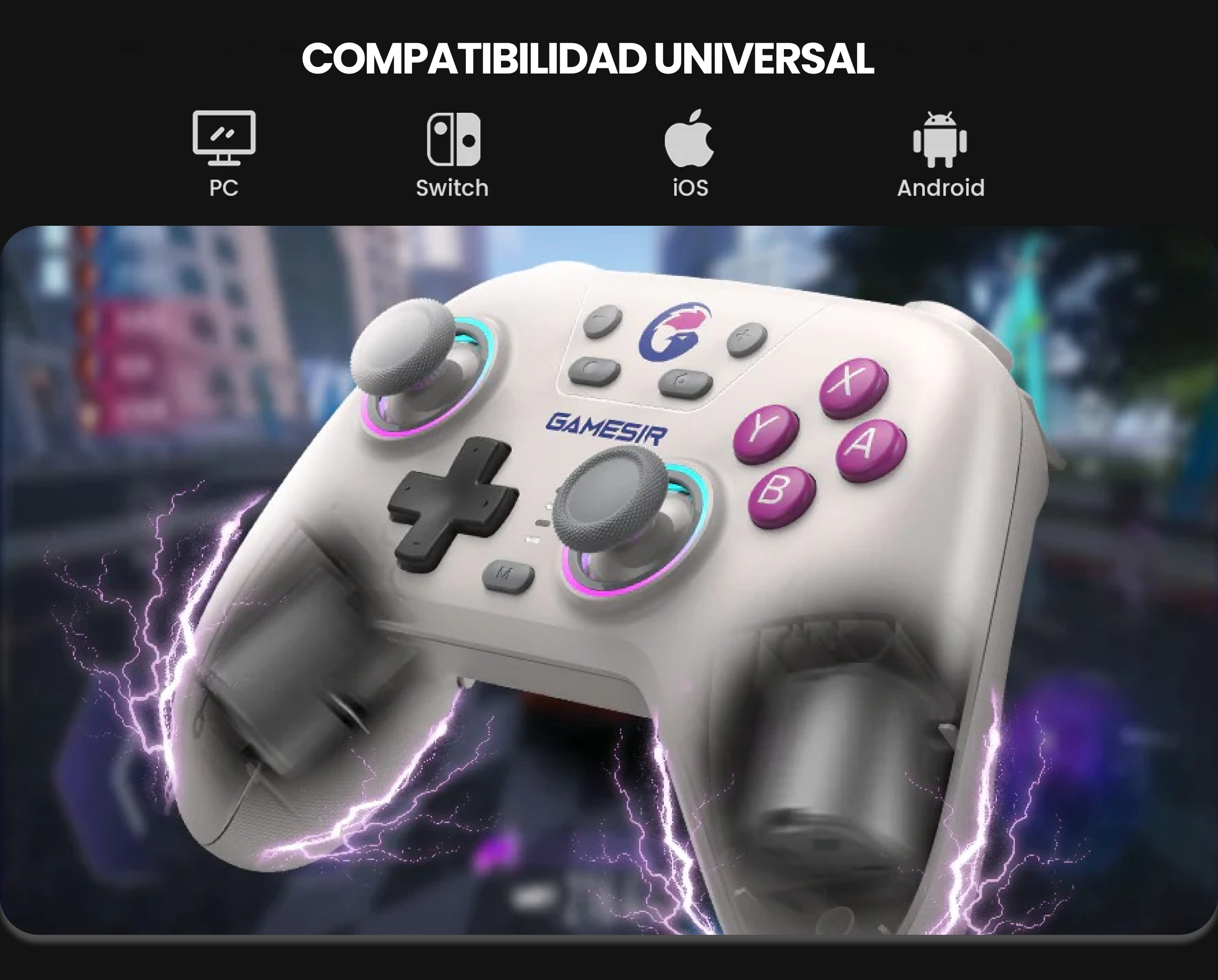 El control incorpora joysticks con efecto Hall antidrift y anillos RGB en los sticks, combinando precisión y diseño moderno. Su conectividad tri-modo y compatibilidad multiplataforma garantizan versatilidad en distintos dispositivos.