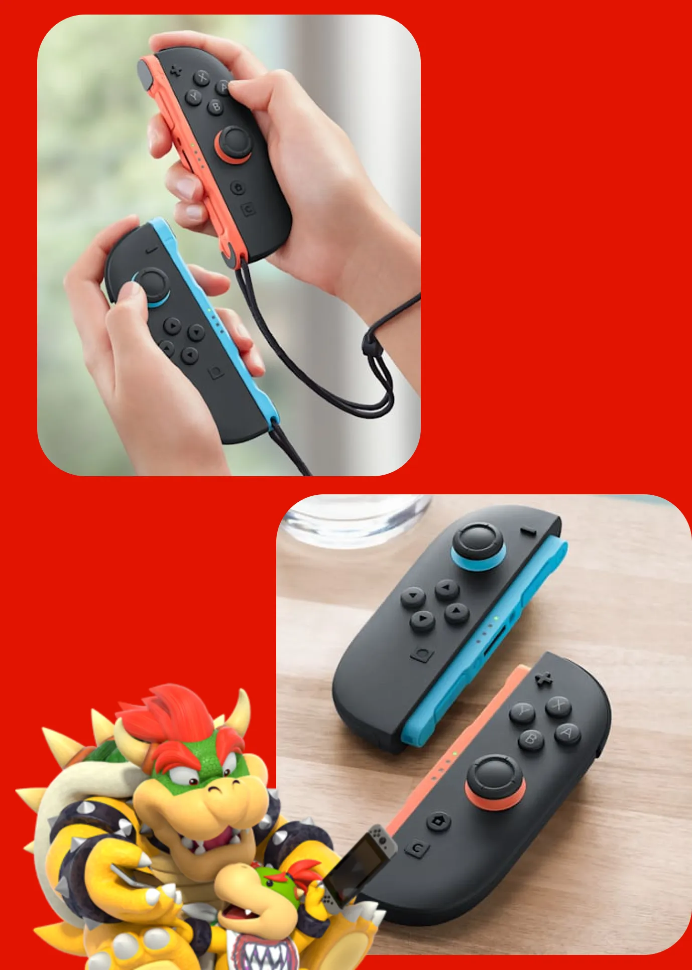 Entre sus principales características se destacan los sensores de movimiento mejorados (acelerómetro y giroscopio) y la tecnología HD Rumble, que proporciona una vibración más refinada y precisa. El nuevo botón C amplía las funciones sociales del sistema, mientras que la posibilidad de uso con función similar a mouse en juegos compatibles añade nuevas formas de interacción. El paquete incluye el control izquierdo, el derecho y las correas (straps), listos para dos jugadores.