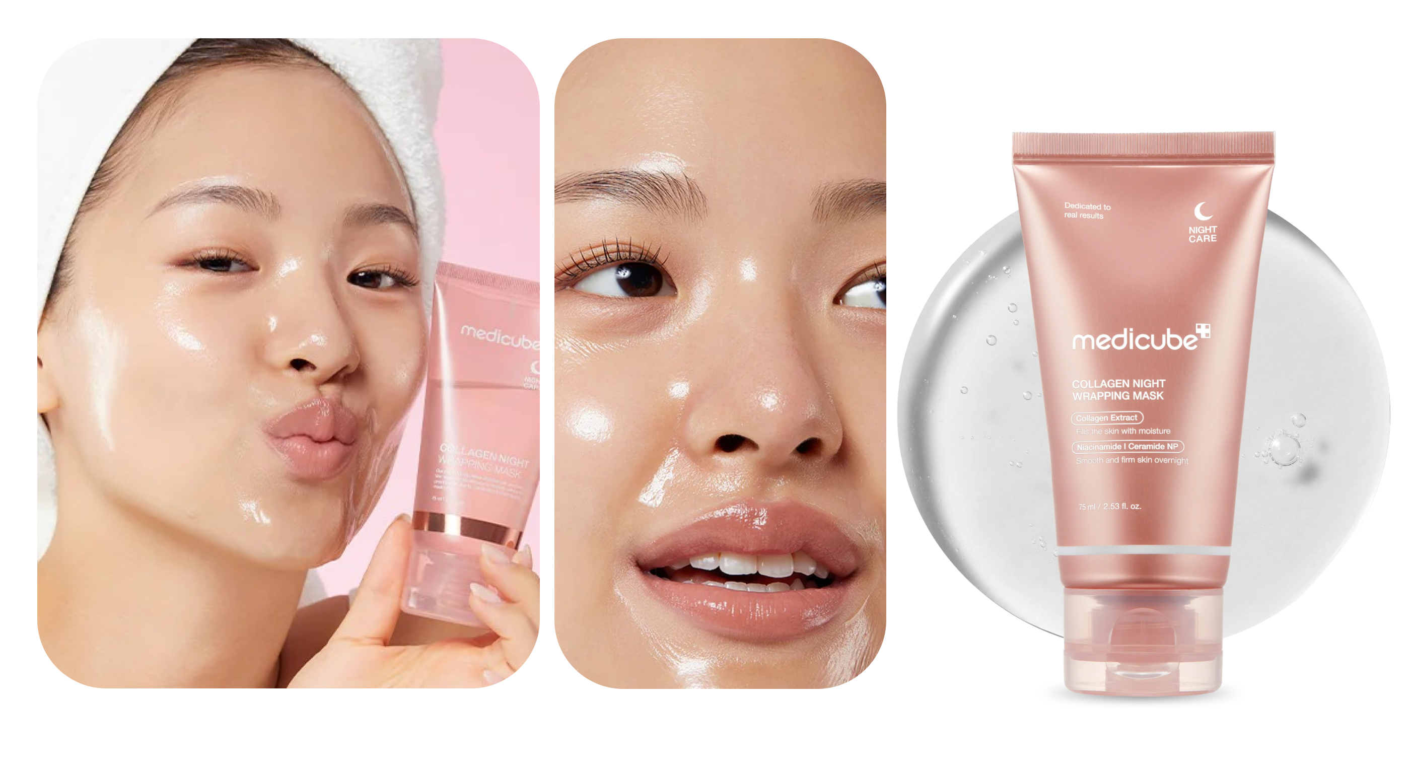 Mascarilla Facial Medicube Collagen Night Wrapping Mask, ideal para piel seca, madura o con pérdida de firmeza. Su fórmula combina colágeno hidrolizado para mejorar la elasticidad, ácido hialurónico que suaviza la textura y manteca de karité que nutre y refuerza la piel durante la noche. Al despertar, el rostro luce más firme, nutrido y revitalizado.