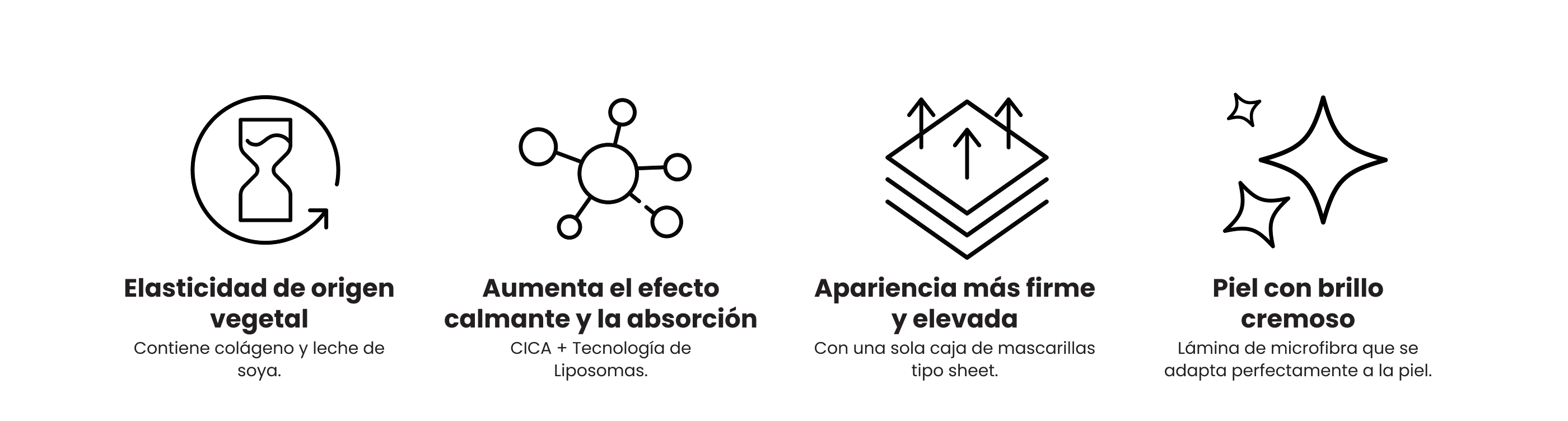 Colágeno vegano y leche de soya, combinados con nueve complejos de péptidos, nutren profundamente la piel, promoviendo la elasticidad y la firmeza.