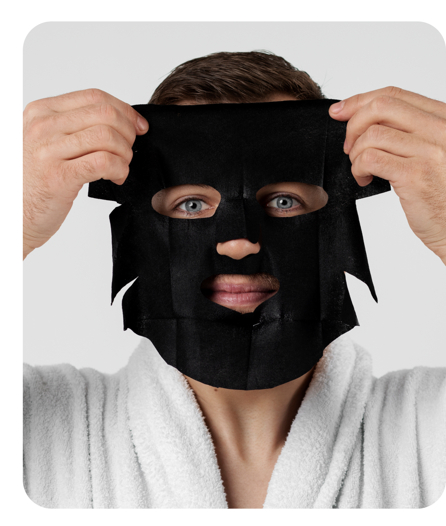 5. Con la mascarilla ya abierta, colócala sobre el rostro y ajusta la parte inferior hacia abajo.