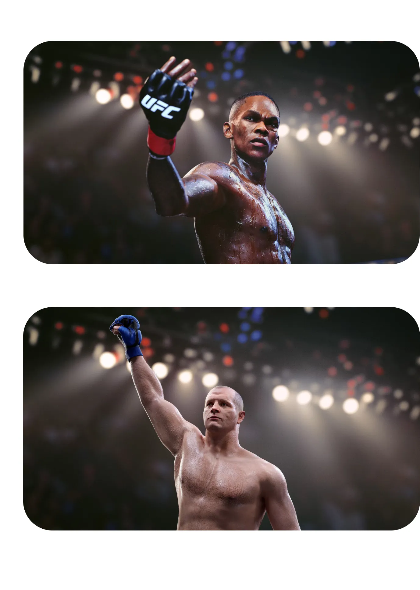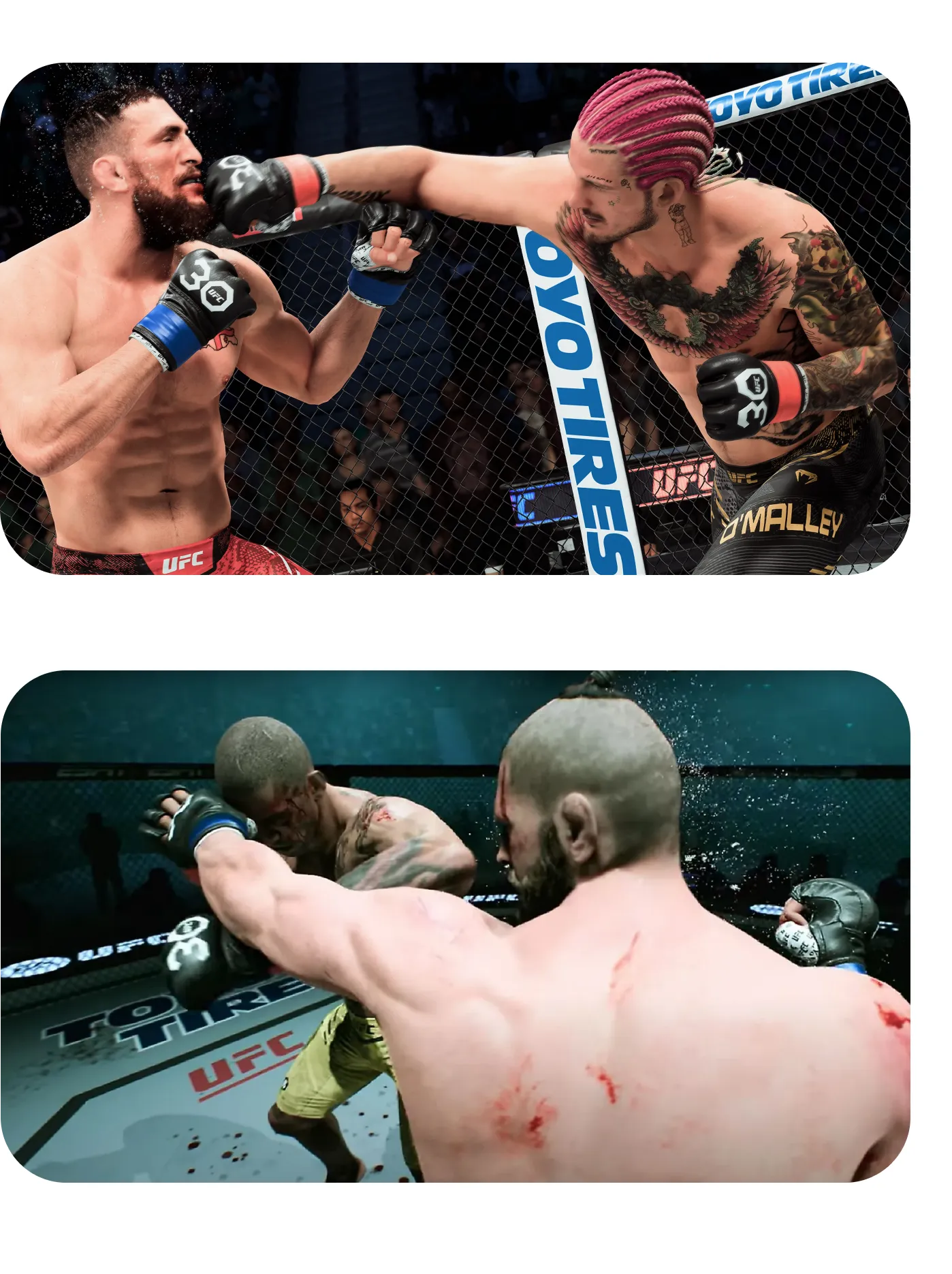 El combate en UFC 5 es más auténtico que nunca gracias a un sistema de daño realista, donde cortes, hematomas e hinchazones acumuladas afectan directamente la movilidad, la defensa y la resistencia de los luchadores. El juego incorpora nuevas animaciones de golpes, reacciones al impacto y finalizaciones cinematográficas, ofreciendo combates estratégicos y viscerales tanto de pie como en el suelo.