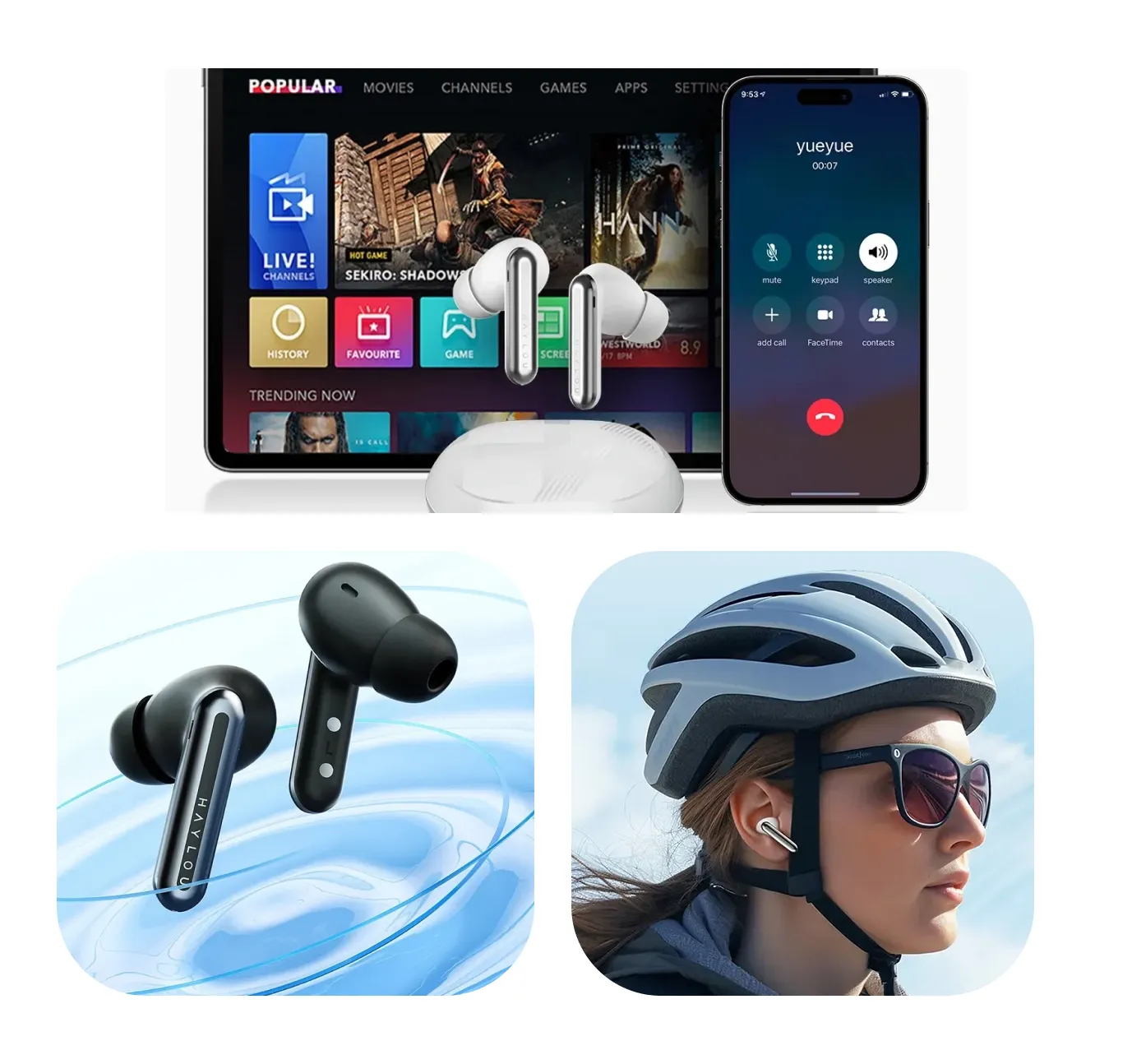 El conjunto de 6 micrófonos con procesamiento de reducción de ruido ambiental (tres en cada auricular) optimiza la captación de la voz en llamadas, reduciendo los ruidos externos incluso en entornos al aire libre o con viento. La app Haylou Sound permite personalizar los modos de cancelación de ruido, ajustar ecualizaciones (EQ) para distintos estilos musicales y alternar entre modos como Transparencia, ANC activo o desactivado según el entorno.